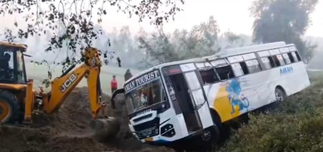 बताया जा रहा है कि नेपाल बॉर्डर के कृष्ण नगर से आ रही अमन टूरिस्ट की बस का पहिया अचानक गड्ढे में जाने से बस बेकाबू हो गई और गहरी खाई में जा गिरी। बस में करीब 50 यात्री सवार थे। दुर्घटना के बाद यात्रियों में अफरा-तफरी मच गई। शोर सुनकर ग्रामीण तुरंत मौके पर पहुंचे और सभी यात्रियों को बस से बाहर निकालने में मदद की। इस दौरान बस चालक अमनदीप, परिचालक और तीन अन्य यात्रियों को मामूली चोटें आईं। बस चालक अमनदीप ने बताया कि वह नेपाल बॉर्डर के कृष्ण नगर से बलरामपुर होते हुए चंडीगढ़, पंजाब जा रहा था, तभी यह हादसा हुआ। पुलिस ने मौके पर पहुंचकर जेसीबी की मदद से बस को खाई से बाहर निकाला और सभी यात्रियों को सुरक्षित स्थान पर पहुंचाया। घायलों को तत्काल उपचार उपलब्ध कराया गया।