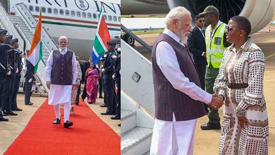 मोदी गौतेंग स्थित वाटरलूफ वायुसैनिक अड्डे (एएफबी) पर पहुंचे, जहां उनका रेड कार्पेट स्वागत किया गया। दक्षिण अफ्रीकी वायु सेना ने उन्हें सम्मानपूर्वक सलामी दी, जबकि राष्ट्रपति भवन के मंत्री खुम्बुद्जो एनत्शावेनी और एक सांस्कृतिक दल ने पारंपरिक नृत्य और गीतों के माध्यम से उनका स्वागत किया।