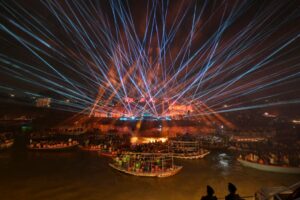 परंपरा और आधुनिकता का संगम चेत सिंह घाट पर 25 मिनट के ‘थ्रीडी प्रोजेक्शन मैपिंग’ शो ‘काशी-कथा’ में दिखा, जिसमें धार्मिक एवं सांस्कृतिक दृश्य जीवंत किए गए। गंगा पार की रेत पर ‘सिंक्रोनाइज्ड क्रैकर्स शो’ और संगीतबद्ध आतिशबाजी ने भी पर्यटकों को मंत्रमुग्ध कर दिया।