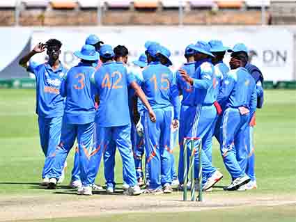 कप्तान वैभव सूर्यवंशी ने टॉस जीतकर बल्लेबाजी करते हुए आक्रामक अंदाज में 74 गेंदों पर 127 रन की विस्फोटक पारी खेली, जिसमें 10 छक्के और नौ चौके शामिल थे। बिहार के 14 वर्षीय बल्लेबाज ने लगातार दूसरे मैच में अपनी पावर हिटिंग से प्रभावित किया। उन्हें आरोन जॉर्ज का बेहतरीन साथ मिला, जिन्होंने 106 गेंदों पर 118 रन बनाए। दोनों ने पहले विकेट के लिए 227 रन की साझेदारी कर भारत को बड़े स्कोर की मजबूत नींव दी।